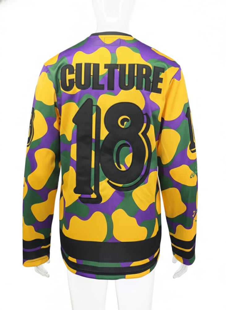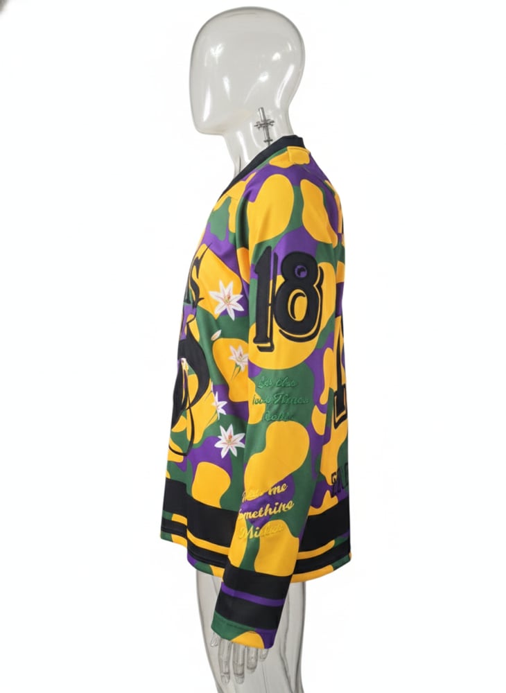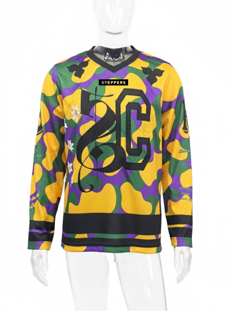 Mardi Gras themed hockey jersey. Relaxed, oversized fit Embroidered graphics replicate an iconic jersey style in large detail. Printed-on stripes. Long sleeve . Machine wash, line dry